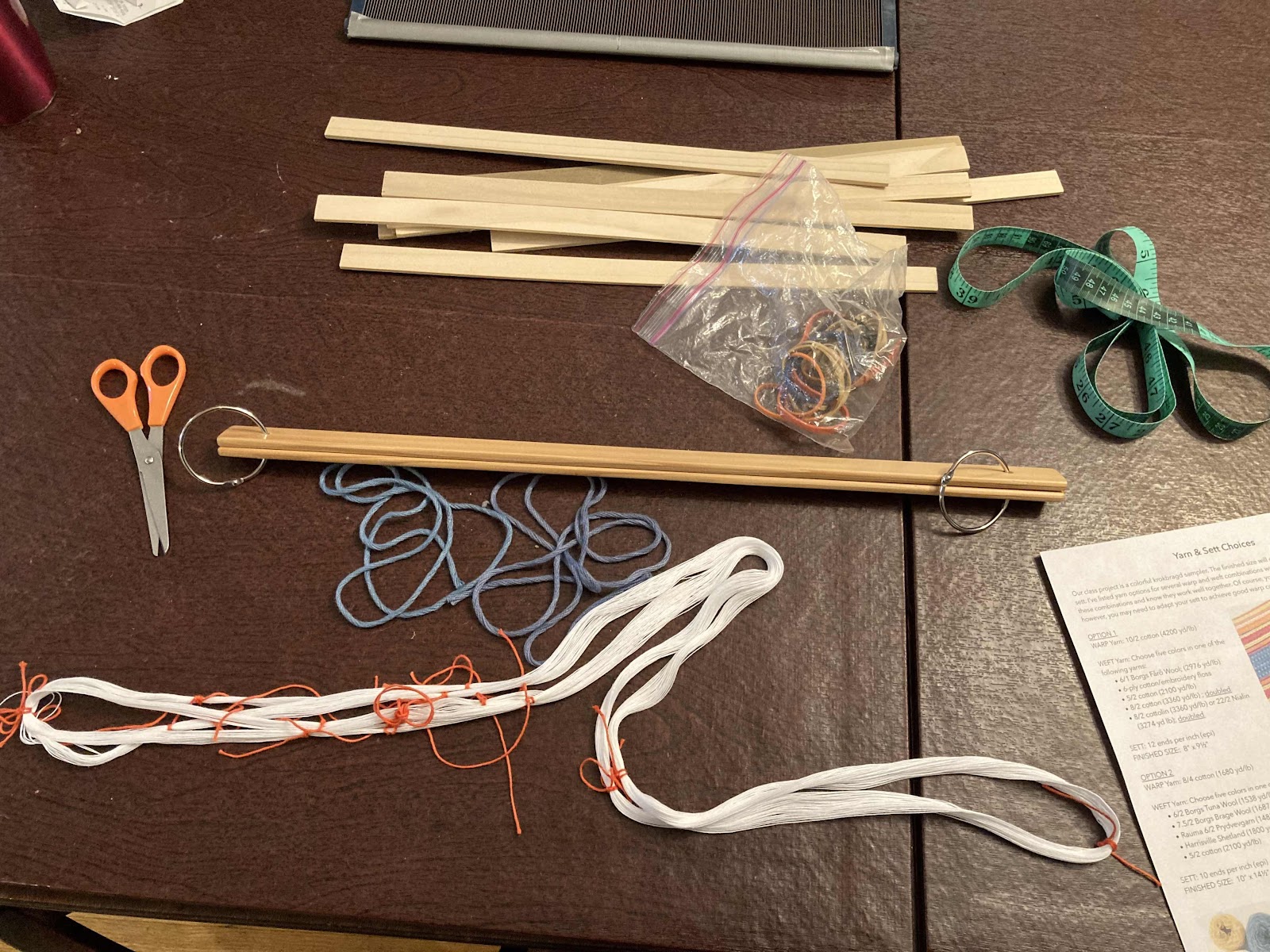 Here I am getting started, with useful things: scissors, cord, lease sticks, the warp, measuring tape, warp sticks (brown paper or a cereal box/cardboard also works well), and the instructions.